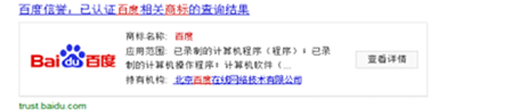 觸發(fā)機(jī)制:無論搜索任何關(guān)鍵詞,只要通過商標(biāo)認(rèn)證的網(wǎng)址,被檢索出現(xiàn)在百度搜索結(jié)果中,都會展現(xiàn)藍(lán)色?標(biāo)。