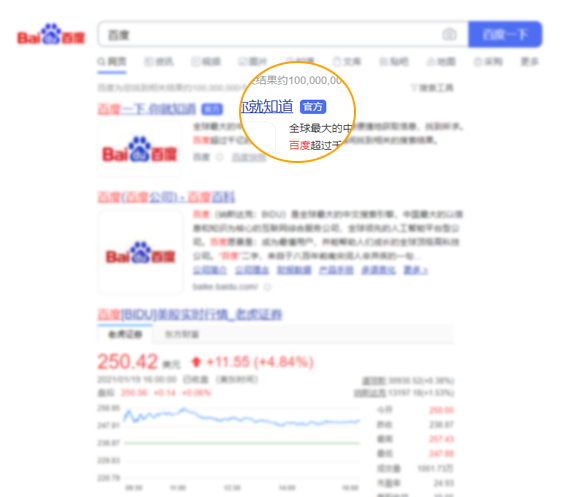 高級版觸發(fā)詞審核通過并生效后,當(dāng)網(wǎng)民精確搜索該觸發(fā)詞時,若認(rèn)證通過的精確網(wǎng)址出現(xiàn)在搜索結(jié)果中,將為其展現(xiàn)藍(lán)色“官方”標(biāo)識。