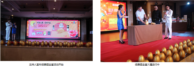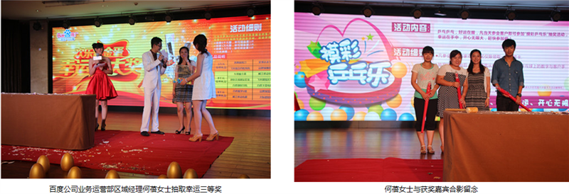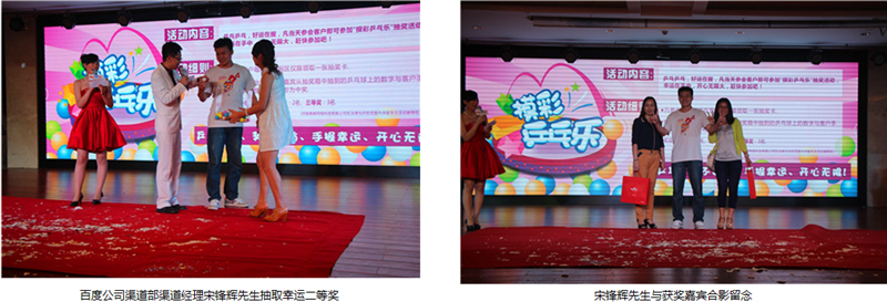 由于市場部和百度客服部的精心策劃和認真籌備,本次答謝會在各環(huán)節(jié)上相比以往都做了創(chuàng)新和改進,“摸彩乒乓樂”活動環(huán)節(jié)抓住了客戶心理,解決了客戶中途離場的難題,客戶中途離場率創(chuàng)造歷史新低。續(xù)費砸金蛋送禮品環(huán)節(jié),更是把本次會議從一個高潮推向另一個高潮??头康耐聜儯脱鐣h(huán)節(jié)的節(jié)目也做了精心的準備,使客戶在晚宴時,既嘗到了菜肴的美味,又對精彩的節(jié)目表演贊嘆不已。