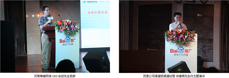 蒞臨本次答謝會現場的領導有:百度公司渠道部渠道經理宋鋒輝先生,百度公司業(yè)務運營部區(qū)域經理何蓓女士,河南青峰網絡科技有限公司CEO 余進先生。會議前半場,青峰網絡CEO余進先生致開場詞,并帶來了《未來撲面而來》的精彩演講,帶領與會嘉賓一起回顧了互聯網發(fā)展的潮流,并以自己多年互聯網從業(yè)經驗,預測未來互聯網發(fā)展的趨勢,引得臺下陣陣掌聲。接下來,由百度公司渠道部渠道經理宋鋒輝先生帶來主題演講,宋經理向到場的嘉賓介紹了百度2013年在各領域取得的巨大成就,并著重介紹了百度推廣新推出的品牌起跑線、問答營銷、企業(yè)之窗等新產品,擴大了客戶網絡營銷的視野,堅定了與會嘉賓與百度推廣一起成長的信心。