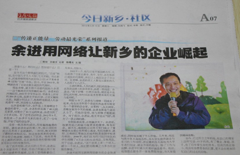 五月十五日,新鄉(xiāng)《平原晚報》,發(fā)表了新鄉(xiāng)市“五一”勞動獎?wù)芦@得者:河南青峰網(wǎng)絡(luò)科技有限公司總經(jīng)理余進的專訪文章:余進用網(wǎng)絡(luò)讓新鄉(xiāng)企業(yè)崛起。