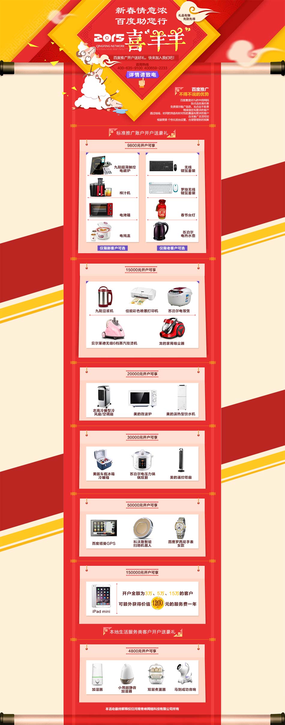 為傾情回饋廣大企業(yè)家,青峰攜手百度在新春佳節(jié)之際特舉行前所未有的“新春情意濃,百度助您行”給力大促銷活動(dòng)。促銷政策如下: